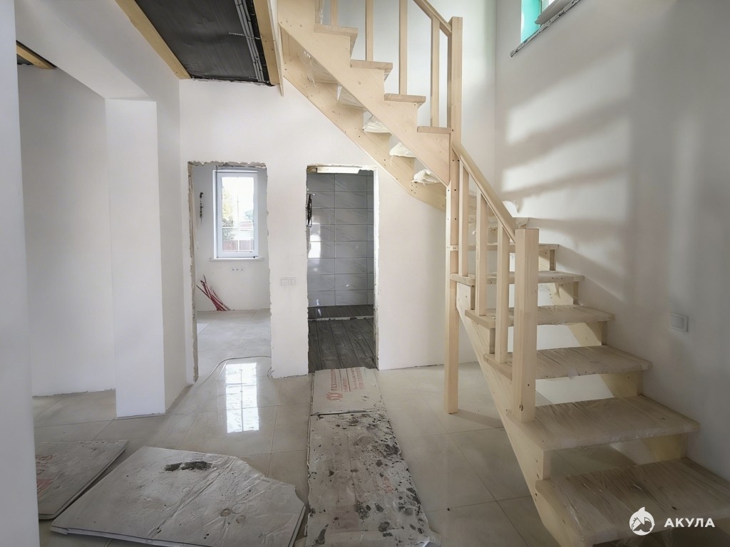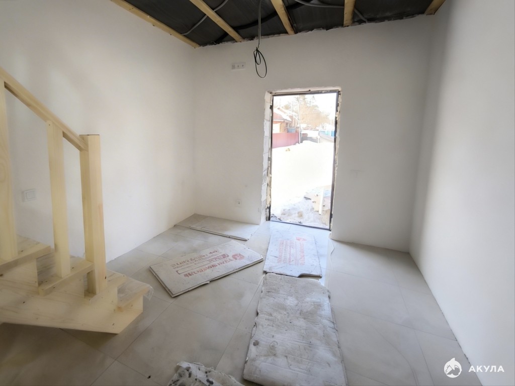 Полы водяные с подогревом по всей площади первого этажа, подогрев от электрического котла. Разводка света. Отмостка вокруг дома. Забор.