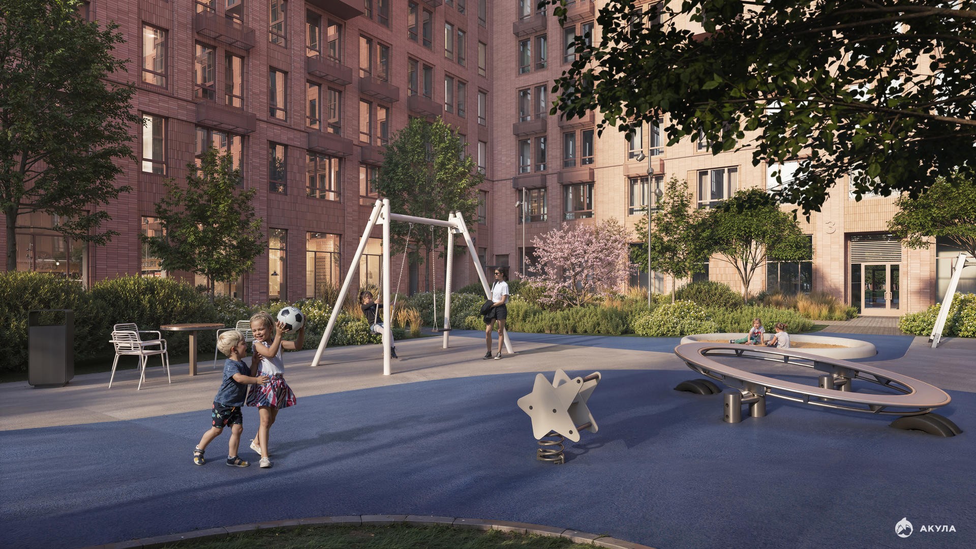 Во внутреннем приватном дворе-парке будут детские и спортивные площадки. А для занятий спортом будут обустроены воркаут-пространства.