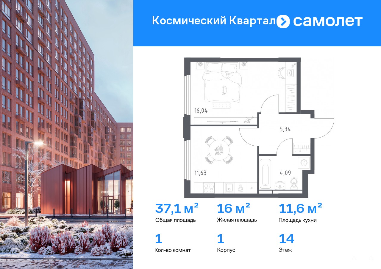 Строим кварталы для жизни с заботой о будущем. Предлагается 1-комнатная квартира комфорт-класса 37, 1 кв.м в корпусе 1 на 14 этаже, в ЖК «Космический Квартал»